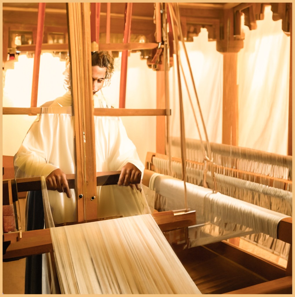 At the looms sat beings who had the appearance of men, though when I looked more closely, I noted that their faces and their bodies seemed slightly translucent and golden like the light. I watched as each being passed a shuttle back and forth through the warp in their loom, laying down weft threads. Over, over, and over, they moved the shuttle, ever so patiently, back-and-forth, from side to side, lifting the warp threads and passing the shuttle through, and then lowering the warp and passing the shuttle back again, then lifting again—each time adding a new line of thread to the fabric.